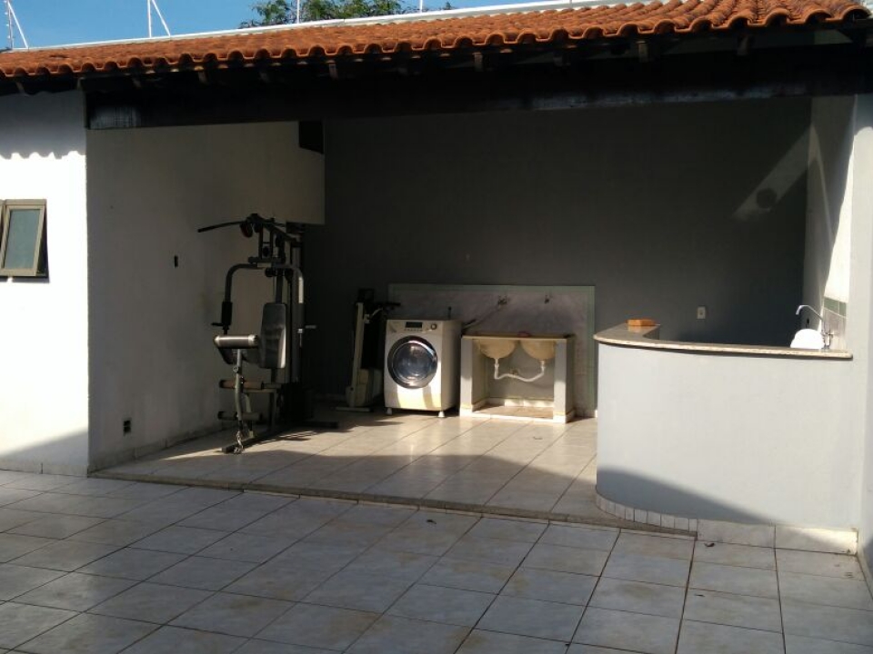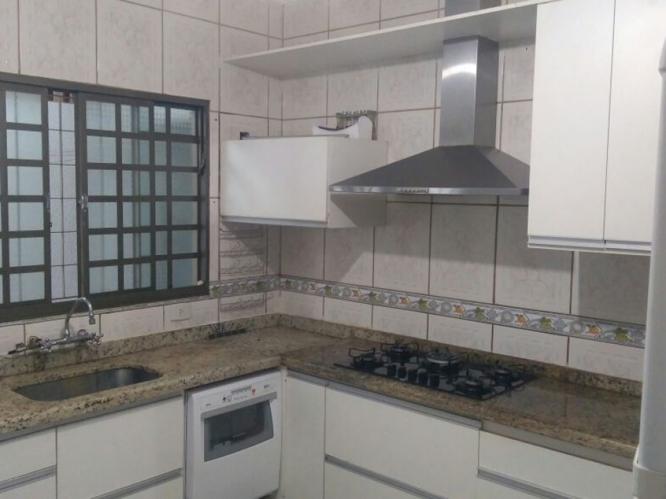 Cozinha planejada com coifa e cooktop, garagem para seis carros, sendo duas com cobertura.