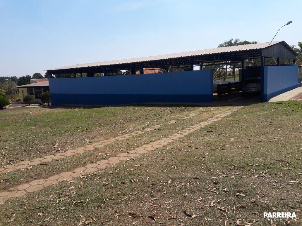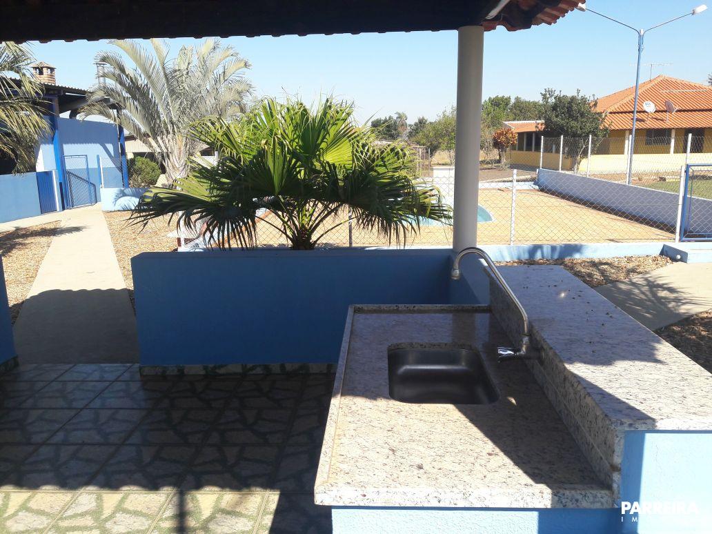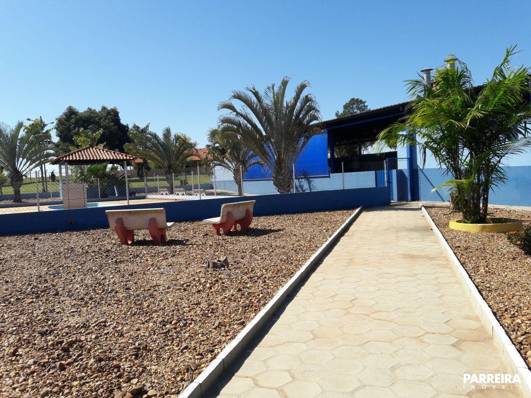 Barracão de festa em estrutura metálica com 275 metros quadrados, recircundado em alvenaria, com portão eletrônico, contendo área gourmet com cozinha ampla, churrasqueira, forno e fogão de lenha, coifas, pedra de granito de apoio, fogão industrial, armário, pia de granito grande, mesa de granito 6 cadeiras, WC feminino e masculino, mesa de esnuquer e de pimbolim, mesa de madeira bruta de 4 metros com respectivos bancos, 8 bancos de pedra distribuídos no salão, reservado para dispensa.