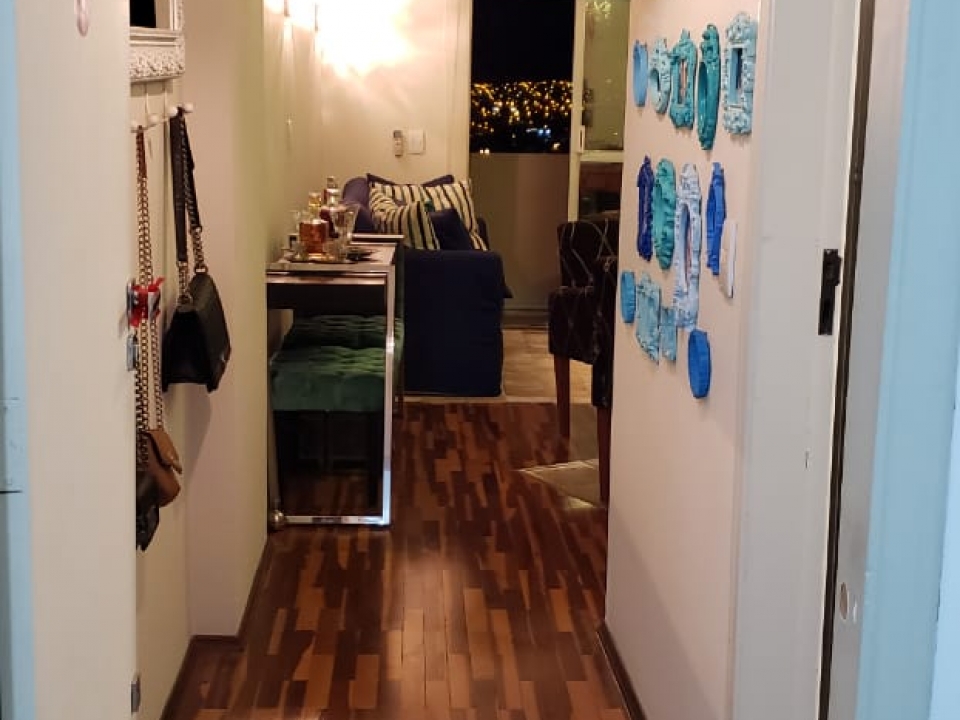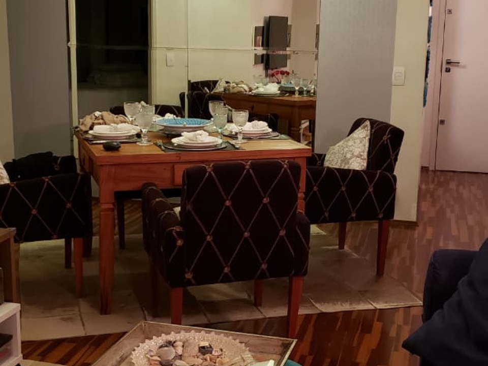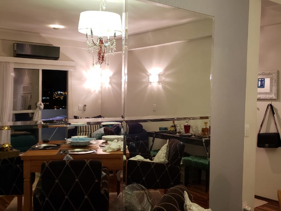 - Sala Ampla com piso de madeira, papel de parede e espelho