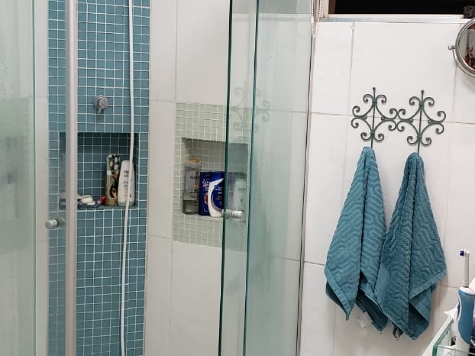- 1 Banheiro com pastilhas de vidro, box temperado e torneira moderna