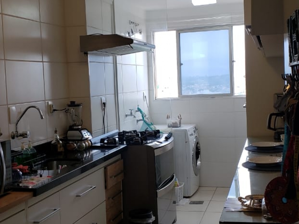 - 1 Cozinha ampla com armários, puxadores cromados, pia de granito preta, divisória da lavanderia em vidro temperado