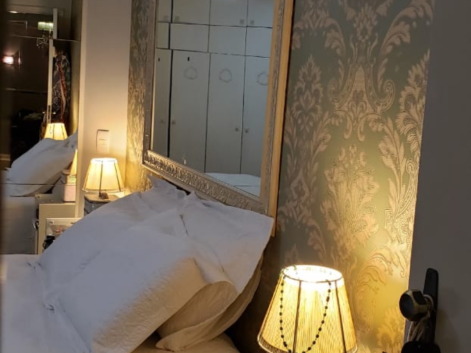 quarto grande com espelho e papel de parede