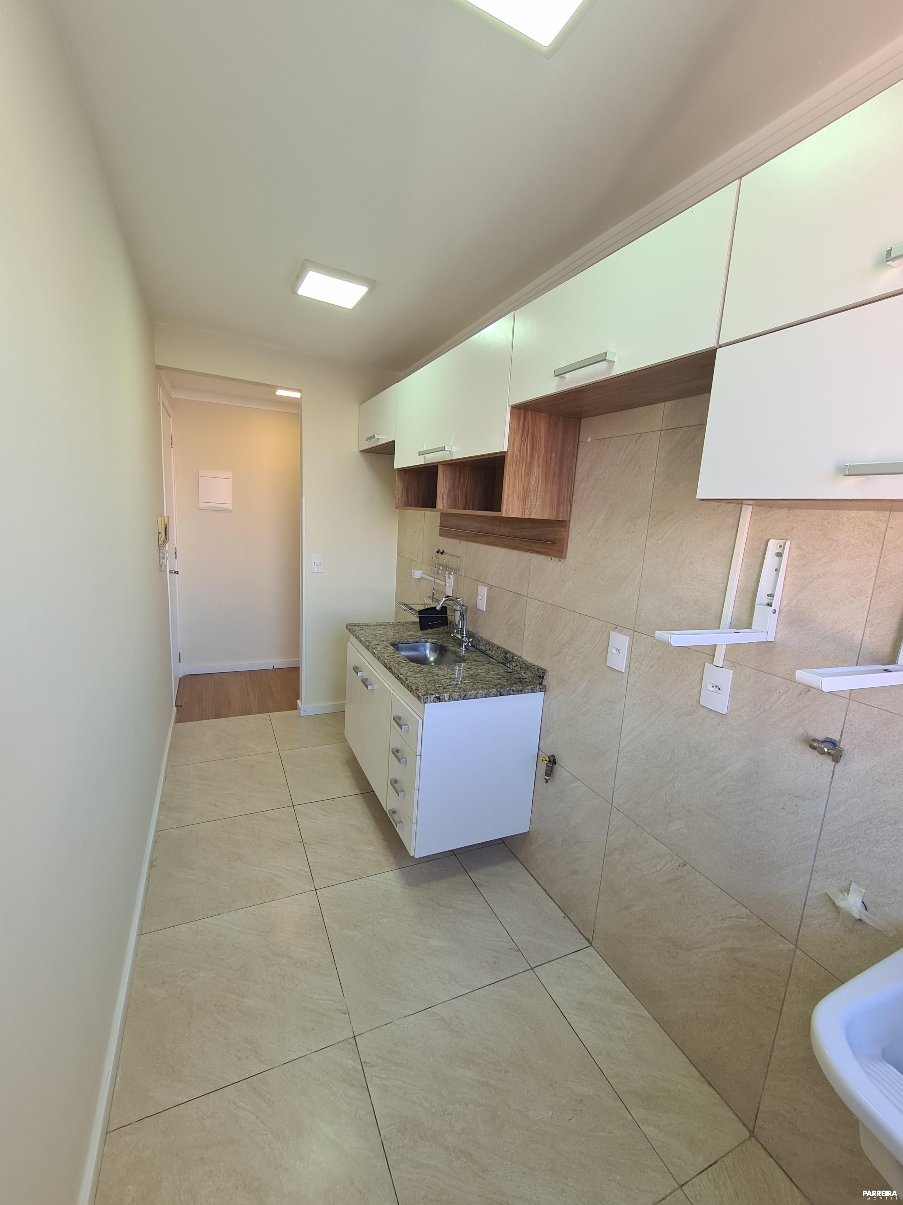 - Sacada com blindex de vidro, tela de proteção e armário;