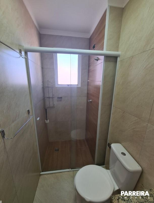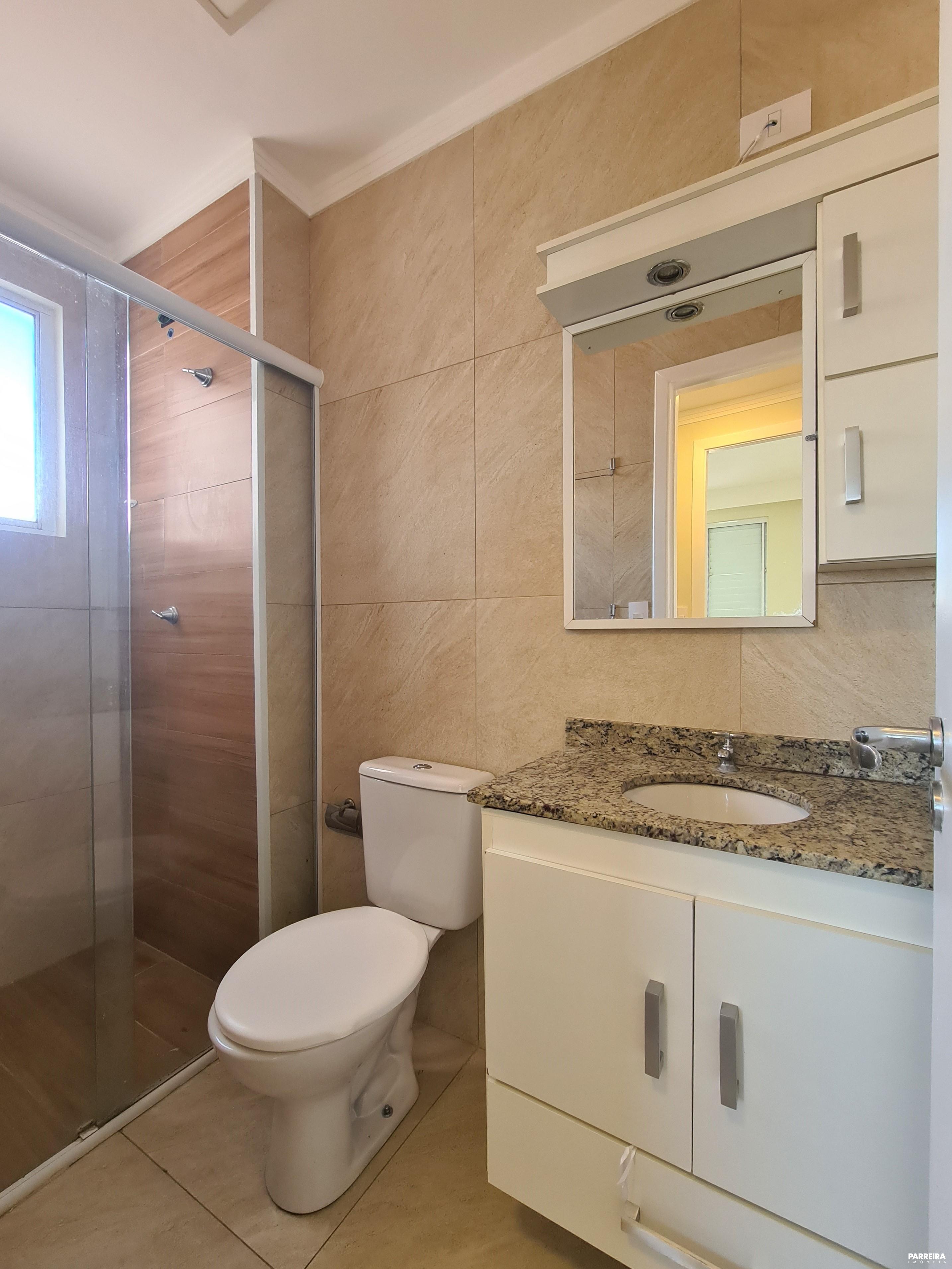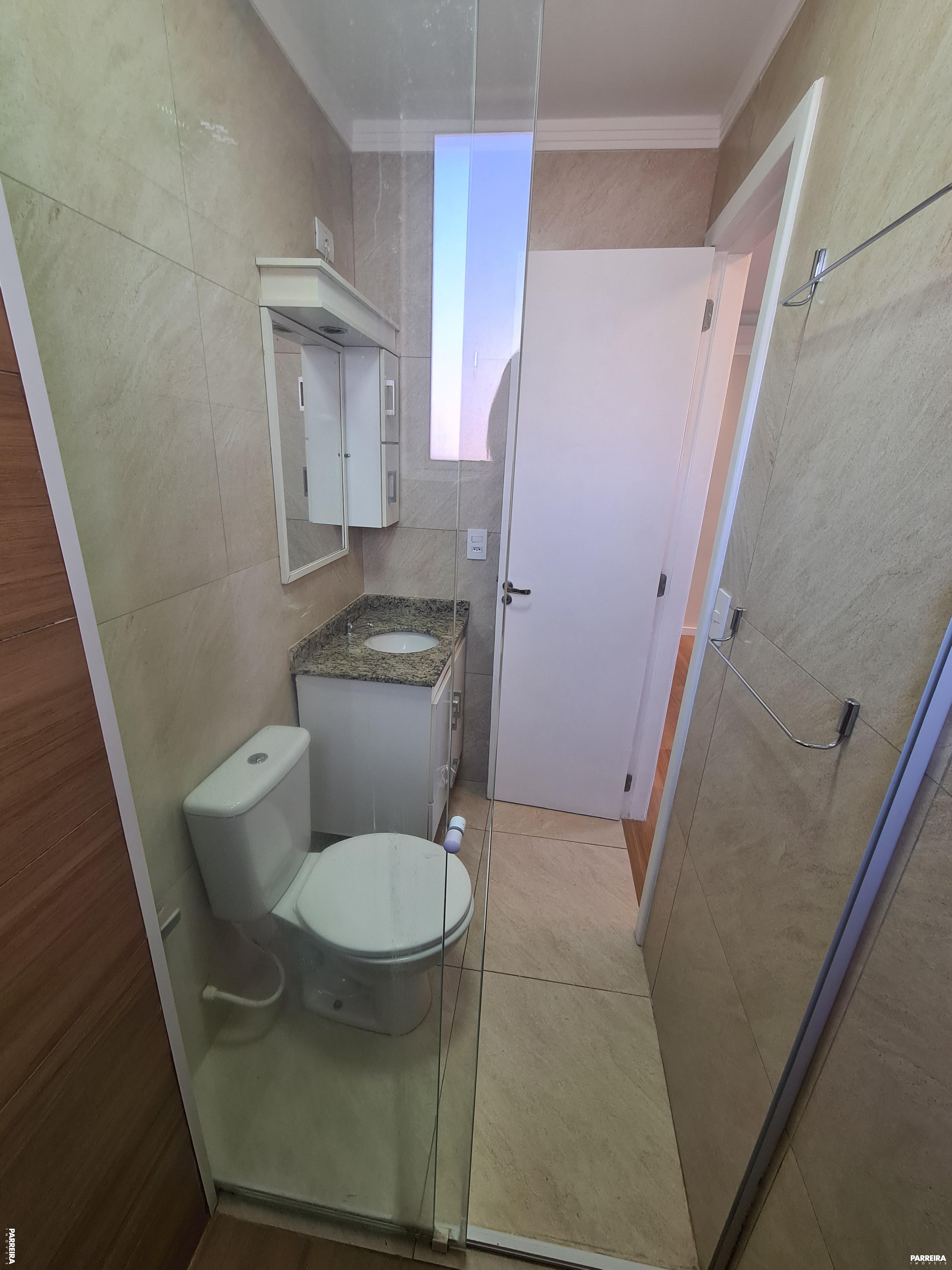 - Banheiro com balcão de pia, espelheira, box de vidro, porta-toalhas;